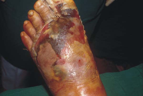 Blisters and sores appear on numb areas of the feet and legs such as forefoot, heel region and as a result of numbness, pressure or injury that goes unnoticed and eventually become portal of entry for bacteria and infection.